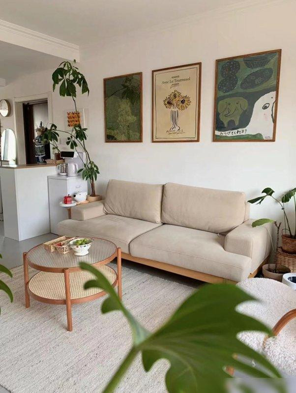 客厅的沙发选了原木框架+布艺垫,和地毯同色系,没有那种“沙发是沙发、地毯是地毯”的割裂感,圆形茶几没有棱角,家里有孩子的话,跑着玩也不怕撞到头——是不是比那种棱角分明的大理石茶几更“贴心”?沙发背景墙的三幅画没有摆得整整齐齐,而是“松松垮垮”的平衡,两边的绿植不是那种高大的发财树,是刚好到沙发背的小盆栽,有没有觉得这种“不刻意”的搭配,比那种堆了一墙装饰画的“用力感”更舒服?沙发旁边的拱形置物架,摆着收藏的小玩意儿,不是“为了拍照而摆”,是“真的喜欢才放”——这种“带着个人痕迹”的布置,才是“家的灵魂”啊。