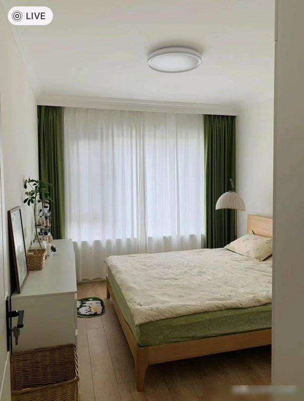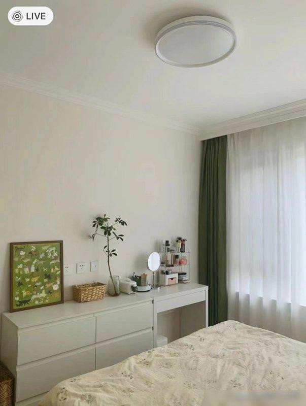 主卧的木地板踩上去软乎乎的,冬天不用穿拖鞋,斗柜选了白色款,上面放了藤编筐和绿植,不是那种“为了拍照好看”的摆设,是“真的能装内衣袜子”的实用——有没有发现很多人家的梳妆台要么堆满化妆品,要么空得像没用过?这个家的梳妆台上面只有几样常用的,反而显得“清清爽爽”。