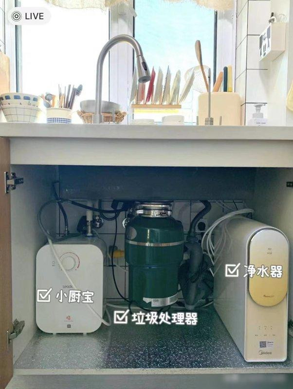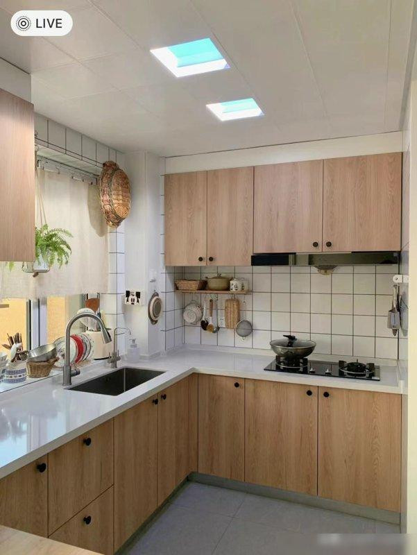 餐厅的裸露承重梁本来是“装修痛点”,结果用一圈石膏线围起来,反而成了“天然的分区线”,比那种“包梁包成大吊顶”的做法聪明太多——既没压低层高,又让餐厅有了“专属感”。圆形吊灯选得太妙了,光打在木餐桌上,暖黄的光裹着碗筷,是不是比那种水晶灯的冷光更有“想吃饭”的欲望?厨房做了开放式,不是为了“跟风”,是真的让餐厅的光通到厨房,青空灯更是“神来之笔”——做饭的时候抬头看“蓝天”,是不是比盯着满是油污的铝扣板吊顶更能缓解疲劳?菜盆下面的小厨宝、垃圾处理器、净水器,这些不是“多余的电器”,是“把麻烦藏起来”的聪明——冬天洗碗不冻手,不用下楼倒厨余垃圾,喝的水没有怪味,这才是“装修为了生活”,不是为了“好看而好看”。